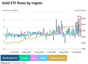 ![]() 15-10-2025 10:00 AM Global gold ETFs attracted +$2.1 billion in net inflows last week, marking their 7th consecutive weekly inflow. This follows the record +$5.3 billion posted in the prior week. Year-to-date, gold ETFs have... |